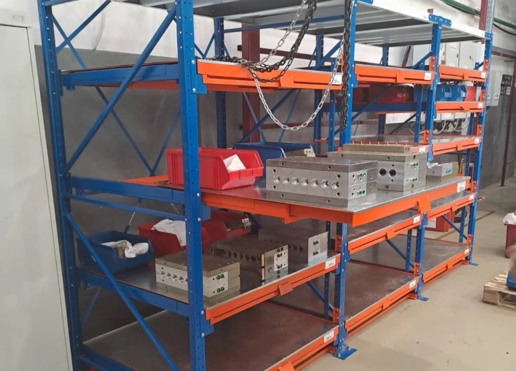 Стеллажи для хранения тяжелой оснастки, штампов и форм для литья с нагрузкой до 1400 кг. Встроенный механизм защиты от одновременного выдвижения уровней. Фиксация полок в выдвинутом и задвинутом состоянии.