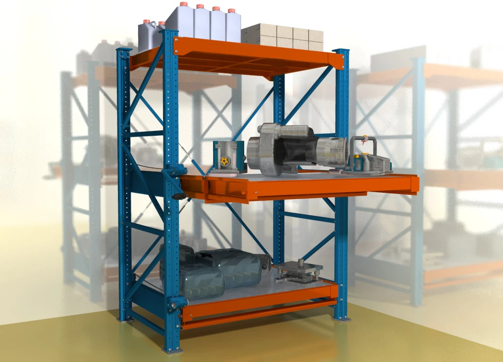 Металлический стеллаж с выдвижными полками для хранения, обслуживания, ремонта легких грузов: небольших штампов, фланцев, литьевых форм, деталей, узлов.
