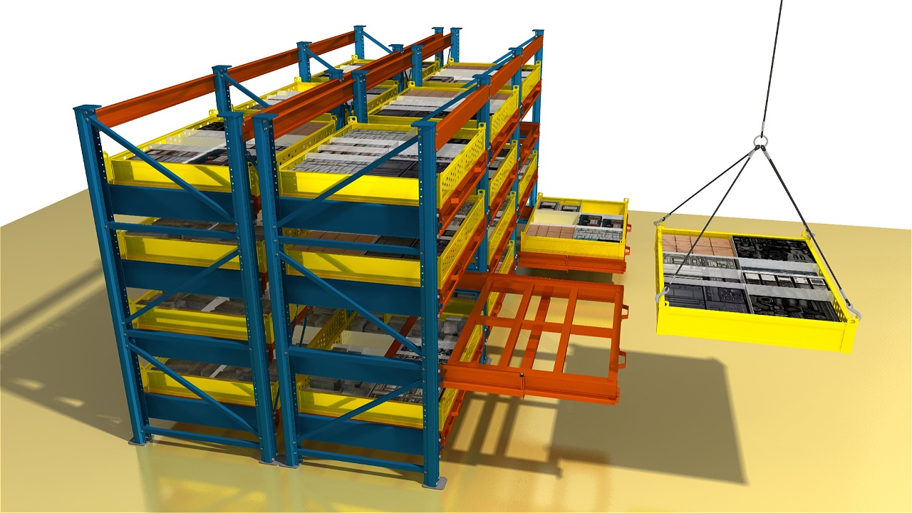 Стеллаж может быть оснащён как ручным, так и электрическим приводом выдвижения полок, что значительно упрощает работу с тяжёлым оборудованием.